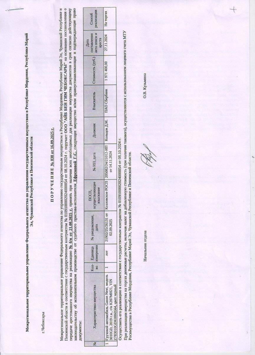 Грузовой автомобиль Gazon Next, модель 3010GD, 2019 г.в., г/н К207МН21, VIN Z783010GDK0060564, цвет черный