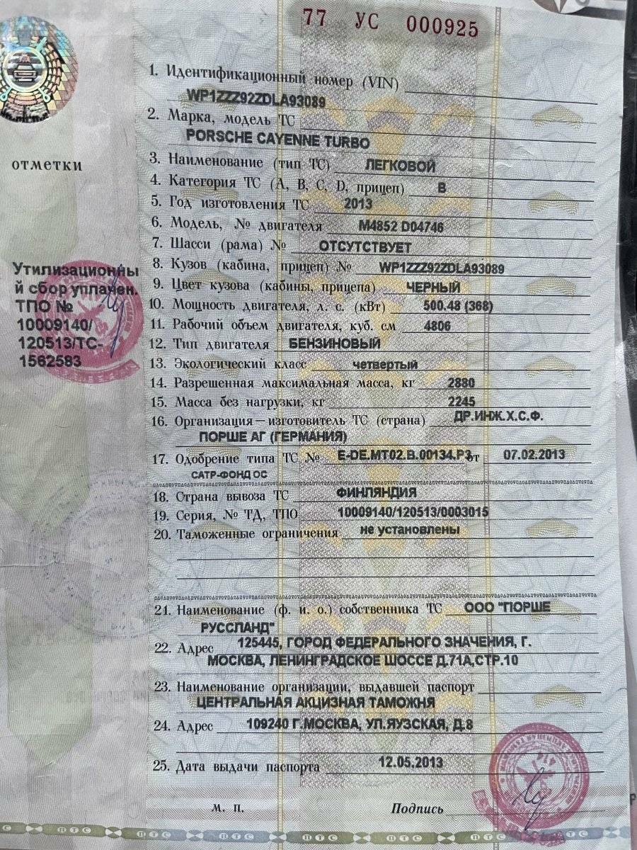 Автомобиль легковой: черный Porsche Cayenne Turbo, 2013 года изготовления, идентификационный номер (VIN) - WP1ZZZ92ZDLA93089. Пробег 155 000 км. Двигатель 500 л.с., имеются незначительные кузовные дефекты, одно колесо имеет грыжу, не исправен сервопривод открывания задней двери, имеются неисправности ходовой части (системы управления): сбой системы пневмоподвески (изменение высоты кузова), неисправна система управления двигателем (сбой в работе цилиндров), сбой системы PSM (стабилизация автомобиля), неисправна система определения давления воздуха в колесах, неисправно статич. адапт.освещ. слева, диагностика цилиндров (эндоскопия) выявила наличие задиров.